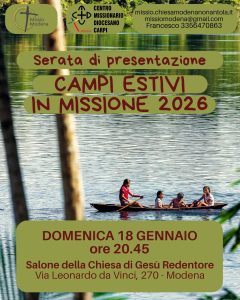 IN PRIMO PIANO Video e progetto Avvento 2025 ALTRE NOTIZIE Lettera di padre Domenico Bertogli sulla visita di papa Leone in Turchia Serata di presentazione CAMPI ESTIVI 2026 Video omelia e testimonianze messa missionaria a Sorbara Video e foto della serata in ricordo di fr. Vittorio Faccin Notizie Flash di Novembre Turchia IL Disarmo delle Parole Messa Missionaria Gennaio 2026 EL Mismo: primo incontro del 8 e 9 novembre Video e progetto Avvento 2025 Natale O’ clock !!! ARCHIVIO NOTIZIEPROSSIMO EVENTO Natale O’ clock !!! Agenda ufficio missionario festival della missioneVideo https://youtu.be/xySH_EwHzcs ARCHIVIO VIDEO I PODCAST ElikyaElikya, la speranza del Vangelo senza confini, Sr Marta Galbiati, Miilano, 14 Dicembre Unidos4.Domenica d'Avvento 2020 - 20 Dicembre 2020GALLERIA FOTOGRAFICA Perché ce l’ha data Diolettera di Debora dal Madagascar ARCHIVIO GALLERIE FOTOGRAFICHEAgenda Diocesana LITURGIA DEL GIORNO unidos_player banner festival_300x200 banner festival_320x213