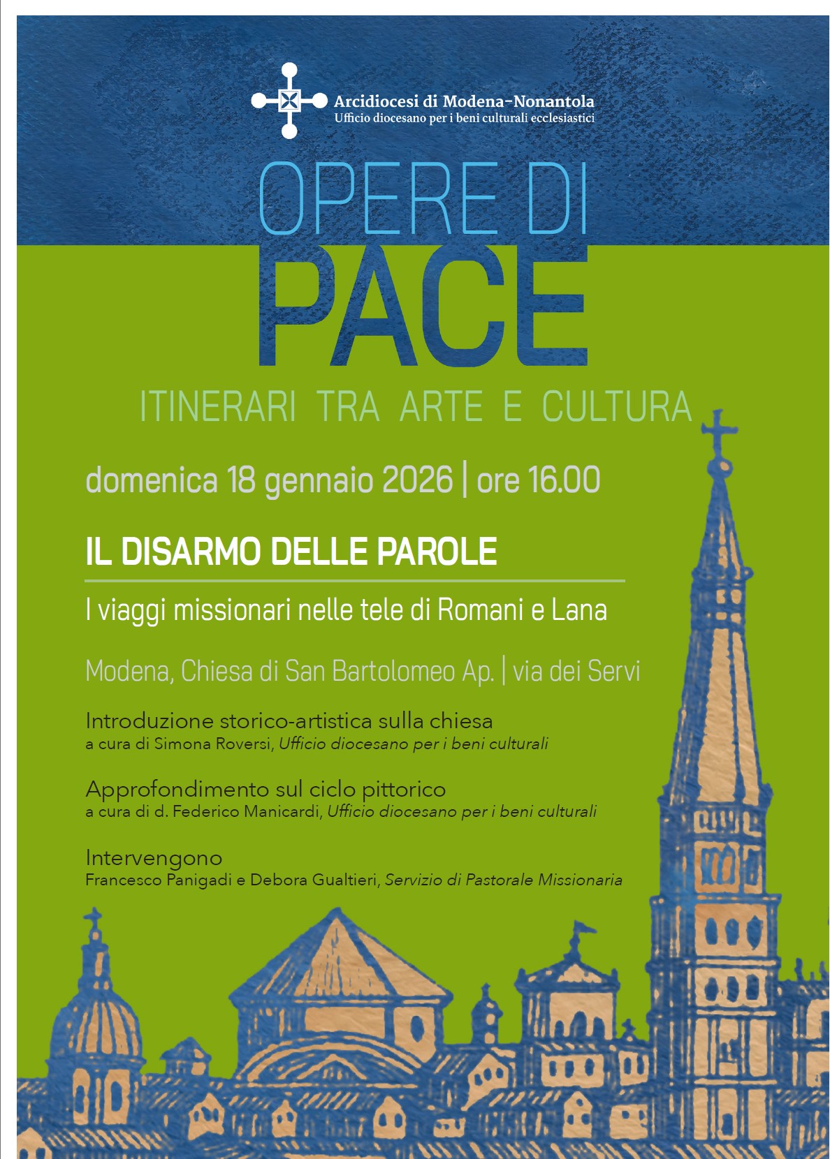 Nel contesto del percorso proposto dall’Ufficio diocesano per i beni culturali ed ecclesiastici, l’incontro, fissato per il 18 gennaio alle ore 16 presso la chiesa di San Bartolomeo, da titolo “Il disarmo delle parole”, prevederà anche una testimonianza di Debora Gualtieri, missionaria laica in Madagascar