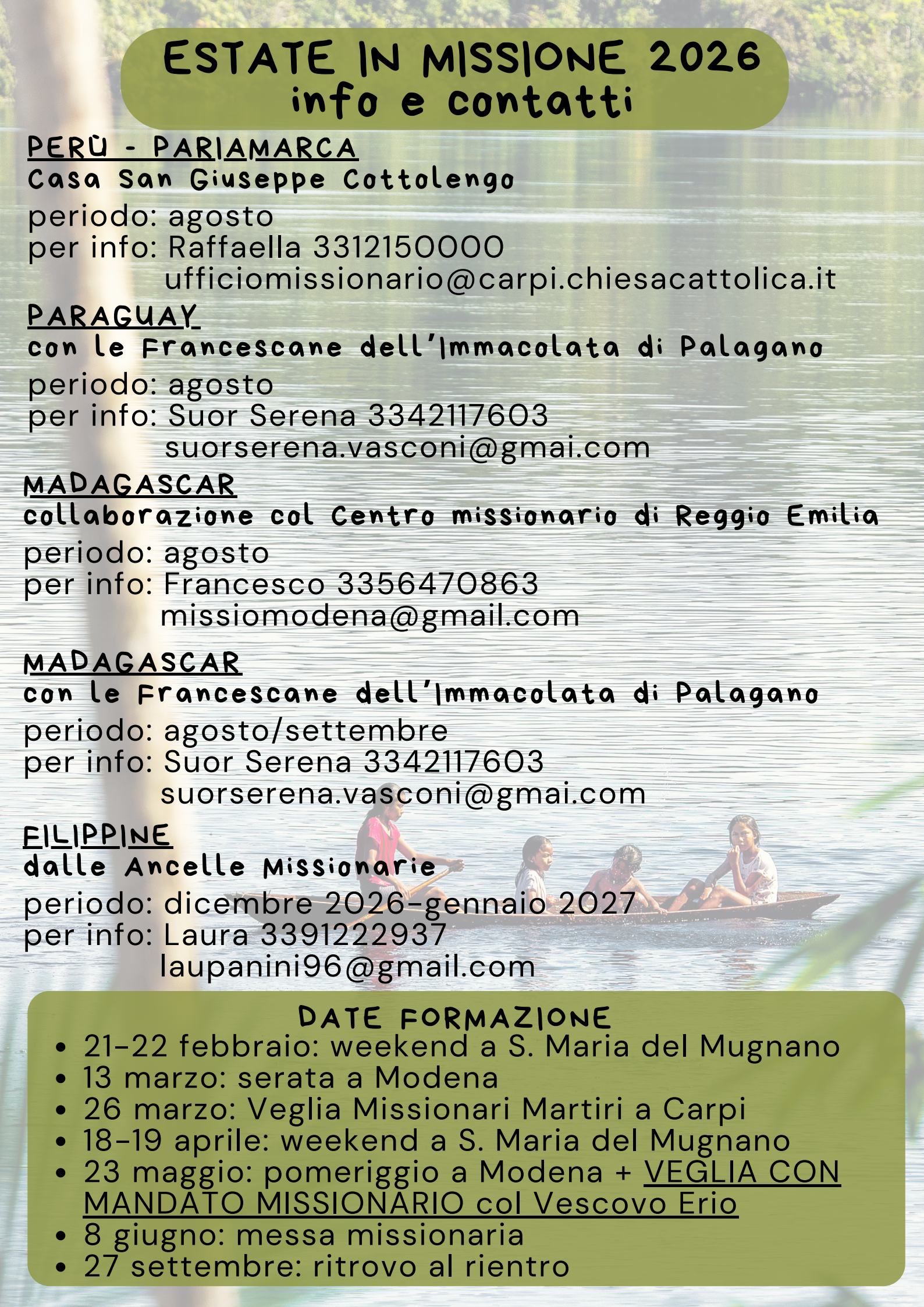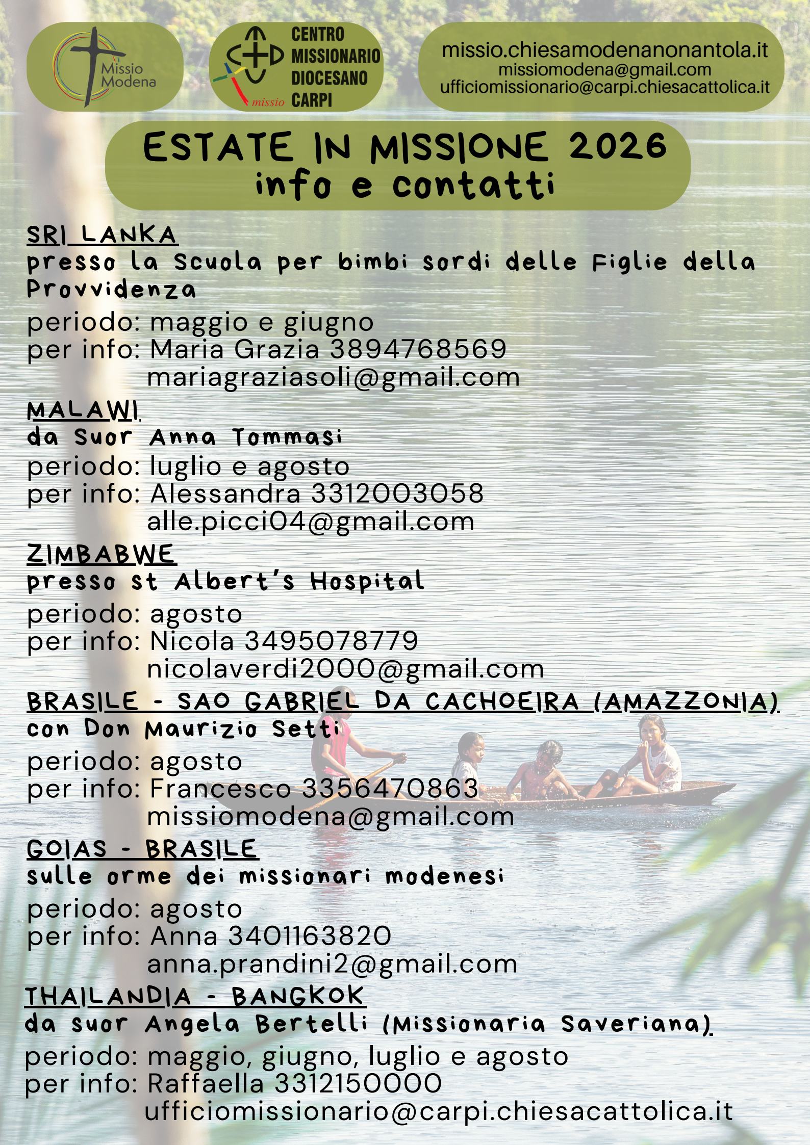 Anche per il 2026 il servizio di pastorale missionaria delle diocesi di Carpi e Modena-Nonantola propone alcune esperienze estive in missione in collaborazione con le suore Francescane dell’Immacolata di Palagano, con le Figlie della Provvidenza per i sordomuti e con le Ancelle Missionarie e l’associazione Talità Kum.