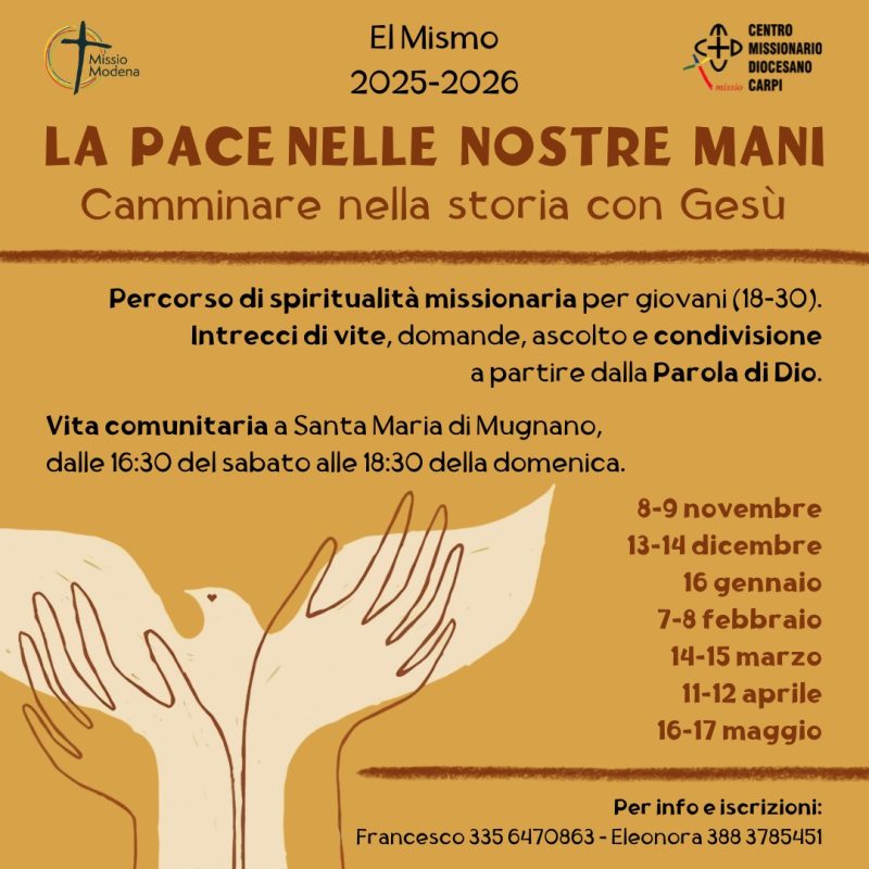 “Cari giovani, non guardate dal balcone la vita, ma immergetevi dentro, come ha fatto Gesù” (papa Francesco). Il MISMO è un percorso di formazione e spiritualità missionaria, aperto a tutti i giovani che vogliono immergersi dentro la vita e vivere con consapevolezza le sfide che ci presenta oggi la Storia. Dopo aver scoperto il progetto di Bellezza che Dio ha preparato per noi, i giovani … Continua a leggere El MisMo 2025_2026