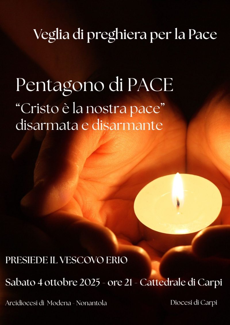 Pentagono di Pace – Cristo è la nostra Pace disarmata e disarmante è il titolo della veglia di preghiera per la pace, molto partecipata, presieduta dal vescovo Erio sabato 4 ottobre presso la cattedrale di Carpi Qui è possibile scaricare il libretto della veglia Ecco il video della riflessione del vescovo Erio: Il video completo di tutta la veglia per la pace: ecco una galleria … Continua a leggere Testo, video e foto dalla Veglia per la pace