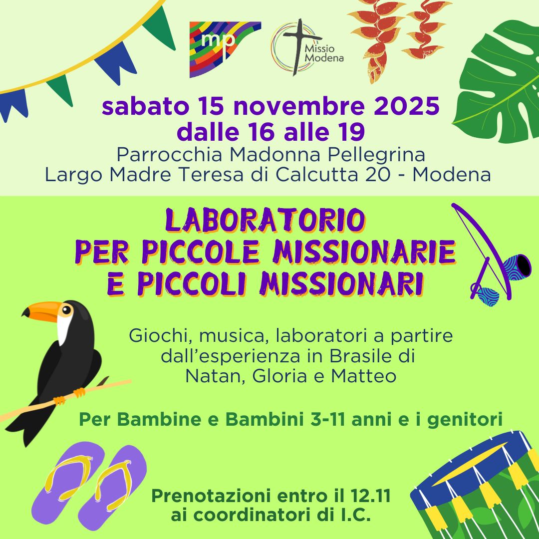 Ufficio Missionario Laboratorio per piccole missionarie e piccoli missionari sabato 15 Novembre Descrizione: Inizio: 15/11/2025 16:00 Fine: 15/11/2025 19:00 Categorie: Ufficio Missionario Indirizzo: Città: Modena Regione: Emilia-Romagna Paese: Italia